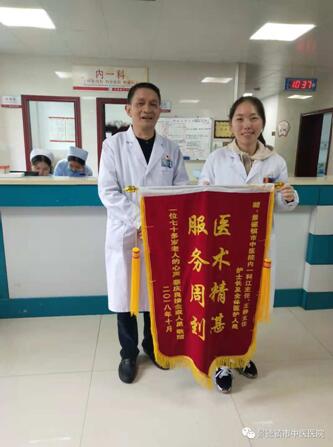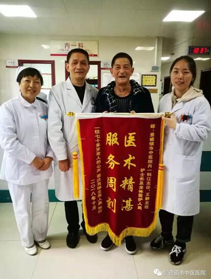 10月25日,患者蔡慶良將一面寫有“醫(yī)術精湛 服務周到”的紅色錦旗送到江西省景德鎮(zhèn)市中醫(yī)院內一科醫(yī)生辦公室,以此贊揚內一科王靜醫(yī)生高尚的品德、精湛的醫(yī)療技術。主管醫(yī)生王靜代表科室接受了錦旗,在患者的要求下,并跟科主任江久及護士長毛向紅留影表示對全科的感謝。