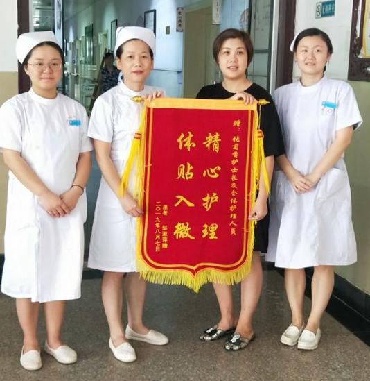 2019年8月10日,已出院的患者鄒女士在家屬的陪同下給景德鎮(zhèn)市中醫(yī)醫(yī)院肛腸科護(hù)理組送來錦旗,以此來感謝肛腸科全體護(hù)理人員對(duì)她住院期間的精心照顧。