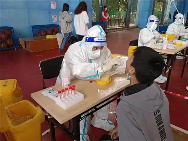 新冠病毒疫情,讓醫(yī)院成為了沒有硝煙的戰(zhàn)場(chǎng)。4月16日晚接到電話醫(yī)院要派人去支援南昌采集核酸,考慮到科室人員的實(shí)際情況,不顧今年高三馬上要高考的兒子,我主動(dòng)請(qǐng)纓,我深知,身為一名醫(yī)護(hù)人員,必須“舍小家為大家”,因時(shí)間匆忙,簡(jiǎn)單收拾行李即刻去醫(yī)院集合,在去醫(yī)院的路上一直在打電話把科室里的工作安排妥當(dāng)才放心。4月16日23:00我們作為第三批援昌核酸采樣隊(duì)踏上馳援南昌的征程。經(jīng)過短暫的休整迅速進(jìn)入備戰(zhàn)狀態(tài)。這次任務(wù)比較緊密和繁重,每天凌晨4點(diǎn)50就集合出發(fā),六點(diǎn)前準(zhǔn)時(shí)到點(diǎn)位開展工作。工作是艱苦的,但這段經(jīng)歷也是充滿意義的。我們隊(duì)20人,10名醫(yī)生,10名護(hù)士,其中7人都是參加過第一批援核酸采樣隊(duì)的,我們隊(duì)就像個(gè)大家庭,彼此如同親人,大家互幫互助,有任務(wù)大家都主動(dòng)申請(qǐng)承擔(dān)。在執(zhí)行任務(wù)時(shí)有同事出現(xiàn)輕度中暑癥狀,有同事被密閉的“大白服”悶出了痱子,因?yàn)閮蓪邮痔子型率侄寂轁q了,有同事因爬樓上戶腳起了泡,為了保質(zhì)保量完成任務(wù),大家仍然堅(jiān)持在崗,不做休息調(diào)整,因?yàn)榇蠹叶忌钪约盒菹⒘岁?duì)友將更辛苦。大家沒有多余的抱怨,依舊奮戰(zhàn)在一線,個(gè)個(gè)都是好樣的,充分體現(xiàn)了我們中醫(yī)院人的職責(zé)擔(dān)當(dāng)。