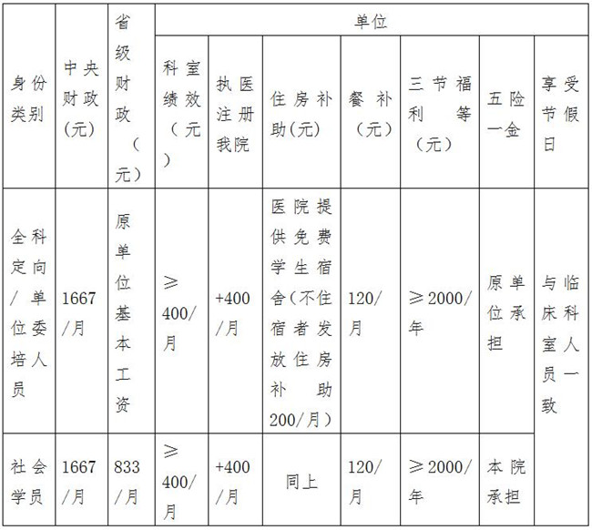 3、面向社會(huì)招收的培訓(xùn)對(duì)象與醫(yī)院簽訂培訓(xùn)協(xié)議,培訓(xùn)對(duì)象自行到當(dāng)?shù)厝瞬胖行霓k理人事代理業(yè)務(wù)。培訓(xùn)期間的生活補(bǔ)助由醫(yī)院負(fù)責(zé)發(fā)放,辦理五險(xiǎn)一金外,醫(yī)院還發(fā)放餐補(bǔ)、三節(jié)福利等,并提供住宿或住宿補(bǔ)貼。社會(huì)化招錄人員培訓(xùn)結(jié)束后自行擇業(yè)。