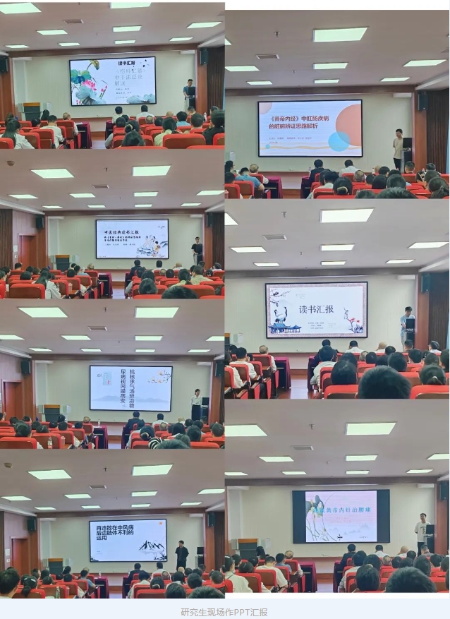 來自中醫(yī)外科學(xué)、中醫(yī)內(nèi)科學(xué)、中醫(yī)骨傷科學(xué)、中醫(yī)眼科、中醫(yī)全科的7名研究生,充分結(jié)合本專業(yè)經(jīng)典原文、經(jīng)典病例及文獻(xiàn),通過PPT圖文并茂的形式,逐一精彩地展現(xiàn)了扎實的中醫(yī)基本功和縝密的臨床思維,以及在臨床中運用中醫(yī)經(jīng)典的心得體會。在匯報的同時,7名研究生導(dǎo)師分別對自己的研究生匯報進(jìn)行點評,院黨委書記岑小杰、副院長樂智卿、副院長喻強(qiáng)強(qiáng)以及科教科劉亞茹科長依次對7名研究生作總結(jié)點評。