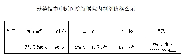 根據(jù)贛醫(yī)保辦函【2024】17號(hào)(關(guān)于加強(qiáng)公立醫(yī)療機(jī)構(gòu)市場(chǎng)調(diào)節(jié)價(jià)醫(yī)療服務(wù)價(jià)格項(xiàng)目管理的通知)、景德鎮(zhèn)市醫(yī)療保障局《關(guān)于景德鎮(zhèn)市中醫(yī)醫(yī)院等2家醫(yī)療機(jī)構(gòu)院內(nèi)制劑價(jià)格備案意見的函》的文件精神,我院因業(yè)務(wù)需要擬新增院內(nèi)制劑溫經(jīng)通痹顆粒,已在江西省藥品監(jiān)督管理局成功完成備案,現(xiàn)予以公示,項(xiàng)目?jī)?nèi)容詳見公示表。
