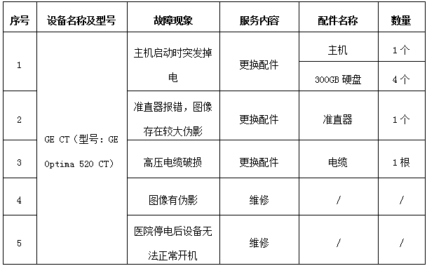 (1)每年提供不限次數(shù)的人工上門維修服務(wù);不限數(shù)量更換所需更換的配件;提供一年至少 4 次/臺設(shè)備的定期維護與保養(yǎng),內(nèi)容包括安全檢查(制定檢查計劃、機械安全檢查、電氣安全檢查、記錄檢查結(jié)果)、影像質(zhì)量檢測、設(shè)備清潔保養(yǎng)、性能測試、運行檢查及校準,按照保養(yǎng)計劃更換易損耗件,提供保養(yǎng)報告單并雙方簽字。